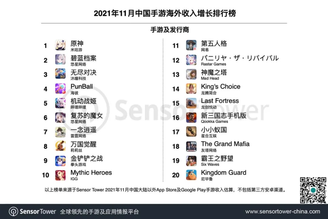 因为11月初新一期人物活动祈愿更新,以及月底2.3版别上线,本期米哈游《原神》移动端海外收入环比增加60.5%,重回出海手游收入榜第一。