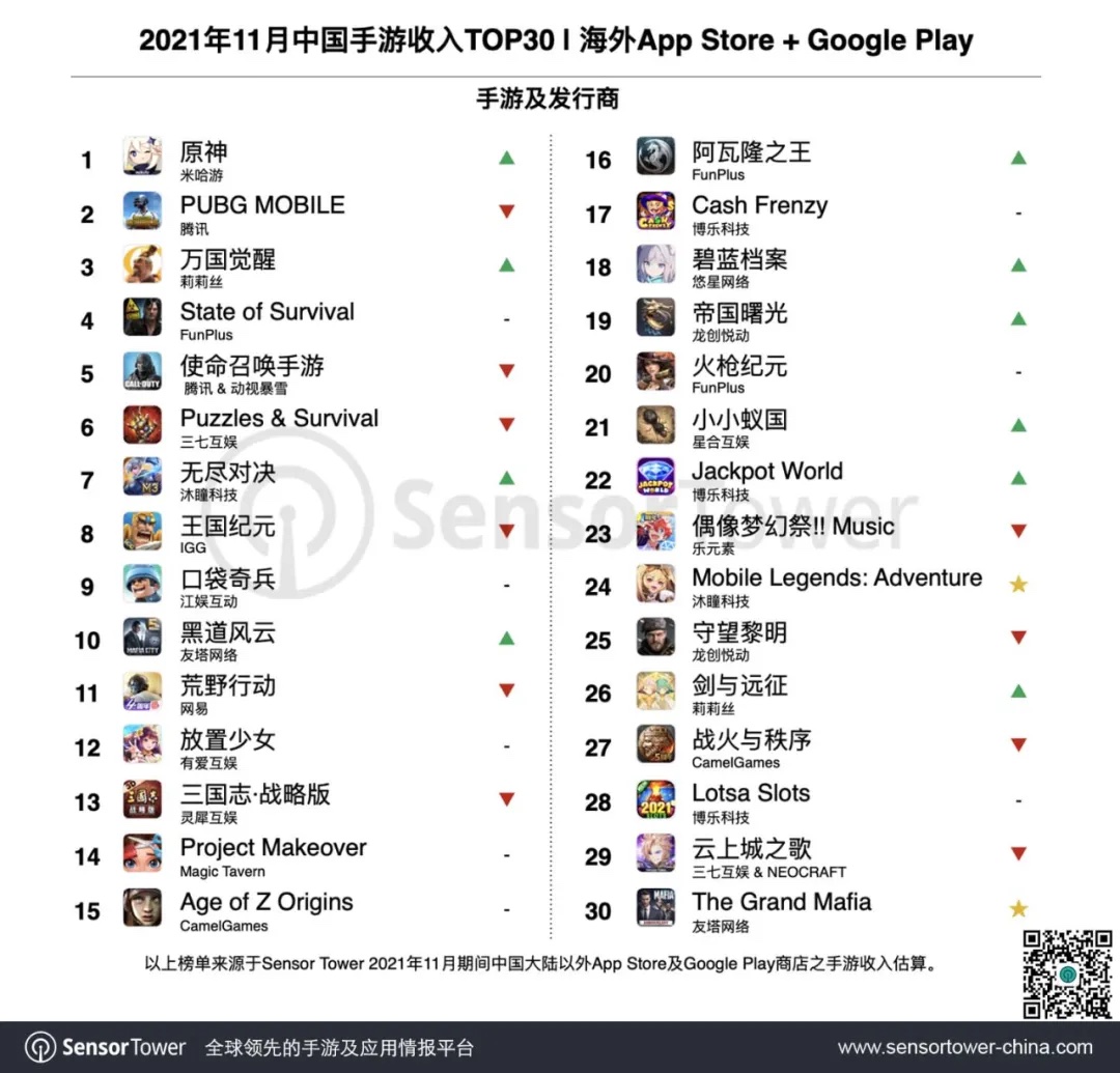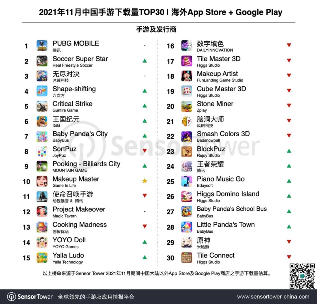 Sensor Tower发布了2021年11月我国手游产品在海外商场收入及下载量排行榜,具体榜单改变如下。