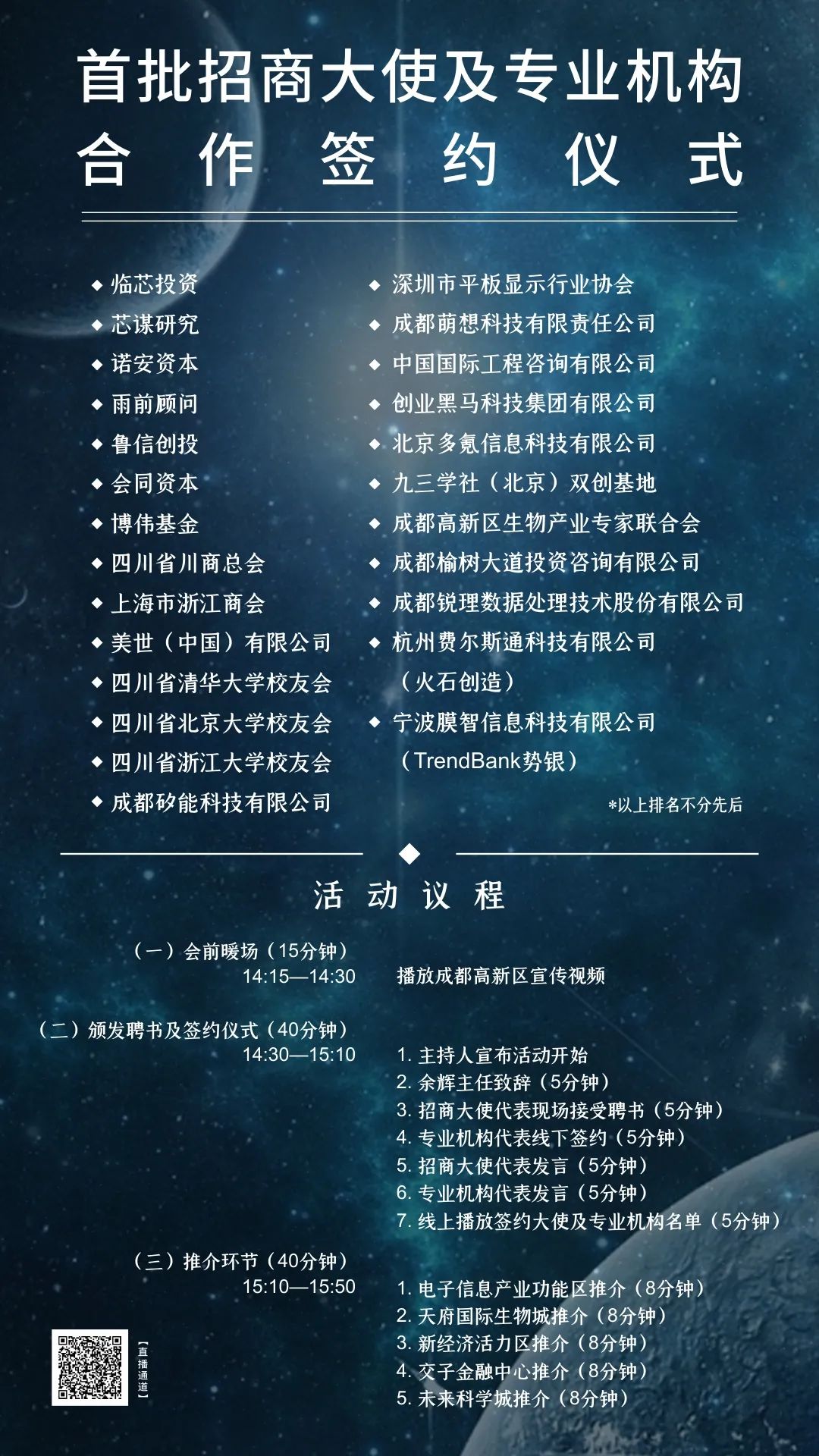在疫情和经济下行的大环境下,成都高新区期望借此次时机,在优化营商环境的基础上,拓荒更多招商途径,集合更优质的高端企业和人才资源,助力高新展开。以下为招商协作企业的具体名单和活动议程,欢迎扫码参加线上会议~