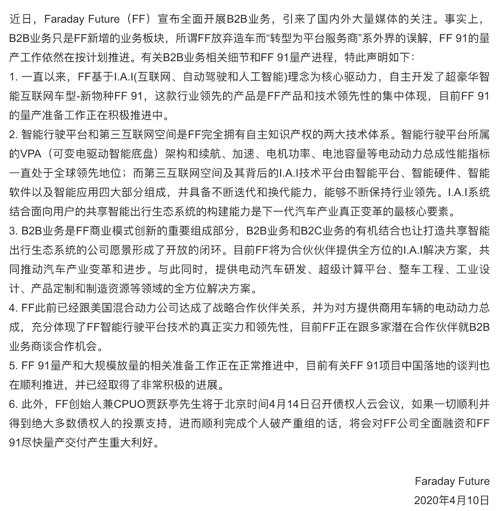 此外,FF 还说到公司创始人兼 CPUO 贾跃亭将于北京时间 4 月 14 日举行债务人云会议,假如一切顺畅并得到绝大多数债务人的投票支撑,从而顺畅完成个人破产重组的话,“将会对 FF 公司全面融资和 FF 91 赶快量产交给发生严重利好”。