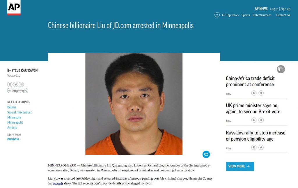,称刘强东在美国商务活动期间,遭遭到了失实指控。美联社
