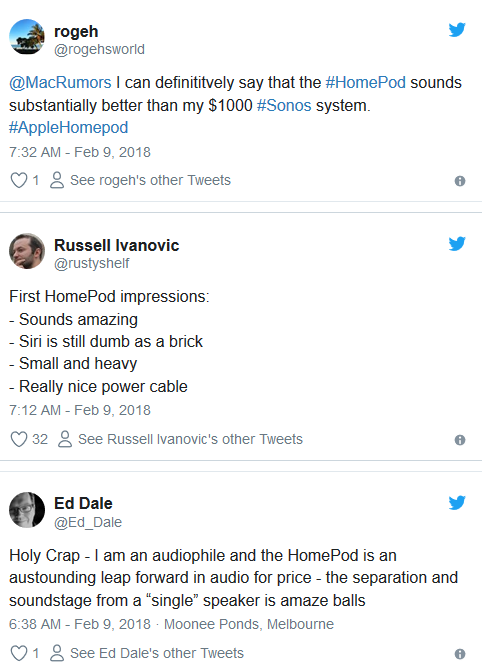 还有许多用户赞扬了HomePod的各个方面,音频发烧友也高度赞扬了在这个价位上,HomePod的音质肯定超卓。